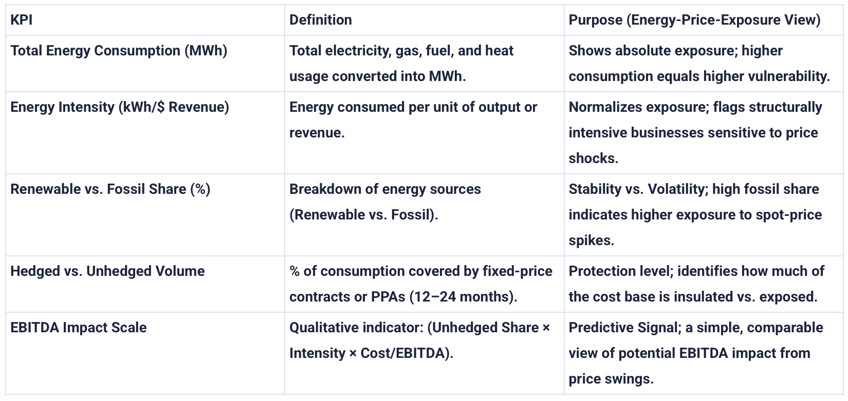 To translate energy exposure into financial relevance, CEPRES utilizes a robust yet streamlined KPI framework. This allows assets to be compared and "risk-scored" without the need for exhaustive bottom-up modeling.
